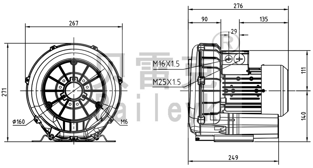 最大風(fēng)量:140m3/h 最大正壓:100mbar 最大負(fù)壓:100mbar 防護(hù)等級(jí):IP55 噪音:56db 重量:13Kg